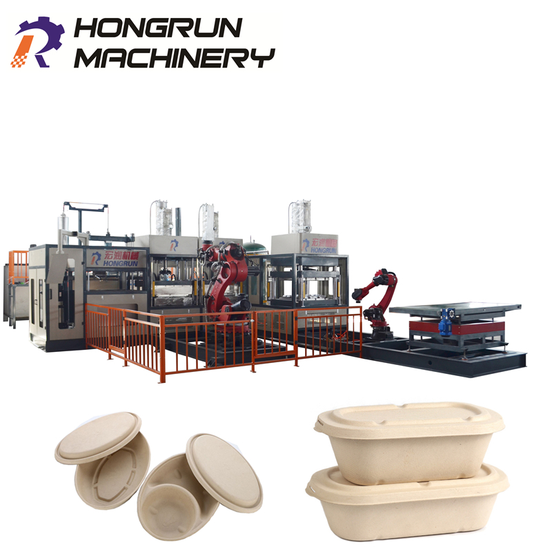 Automatic pulp food tableware machineEquipment Overview The fully automatic robot pulp meal box machine is an intelligent production line that integrates pulp molding, drying, hot pressing, trimming, sorting, and packaging. It is designed specifically for producing biodegradab